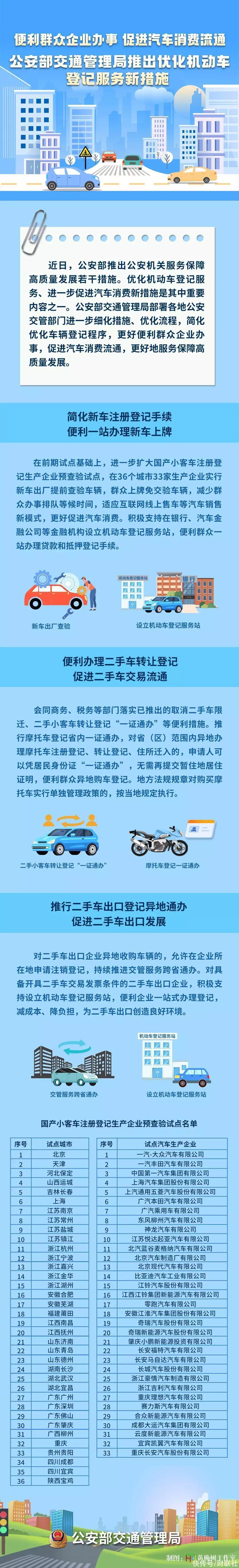 公安部交管局推出优化机动车登记服务新措施 加快推进小汽车登记和驾驶证考试业务下放至县级交管部门近日,公安部交通管理局部署各地公安交管部门进一步细化措施、优化流程,简化优化车辆登记程序。简化新车注册登记手续,便利一站办理新车上牌。在前期试点基础上,进一步扩大国产小客车注册登记生产企业预查验试点,在36个城市33家生产企业实行新车出厂提前查验车辆,群众上牌免交验车辆。便利办理二手车转让登记,促进二手车交易流通。推行二手车出口登记异地通办,促进二手车出口发展。加快推进小型汽车登记和驾驶证考试业务下放至县级公安交管部门,减轻农村群众往返地市办事负担。进一步扩大县级业务范围,鼓励有条件的县级车管所办理货车登记业务,选择在部分具备条件的县级车管所试点办理大中型载客汽车登记业务,更加便利农村群众就近办事。