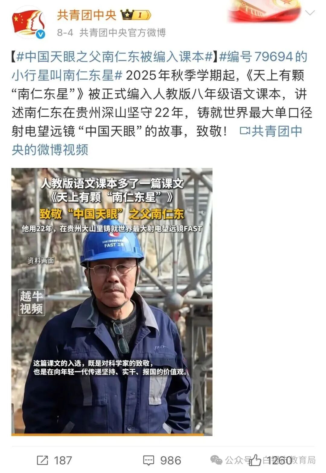 记者了解到,教材编写组经过充分调研,决定以著名报告文学作家王宏甲的长篇传记作品《中国天眼:南仁东传》为基础,邀请作者将该传记作品凝缩成一篇3000字左右的课文。