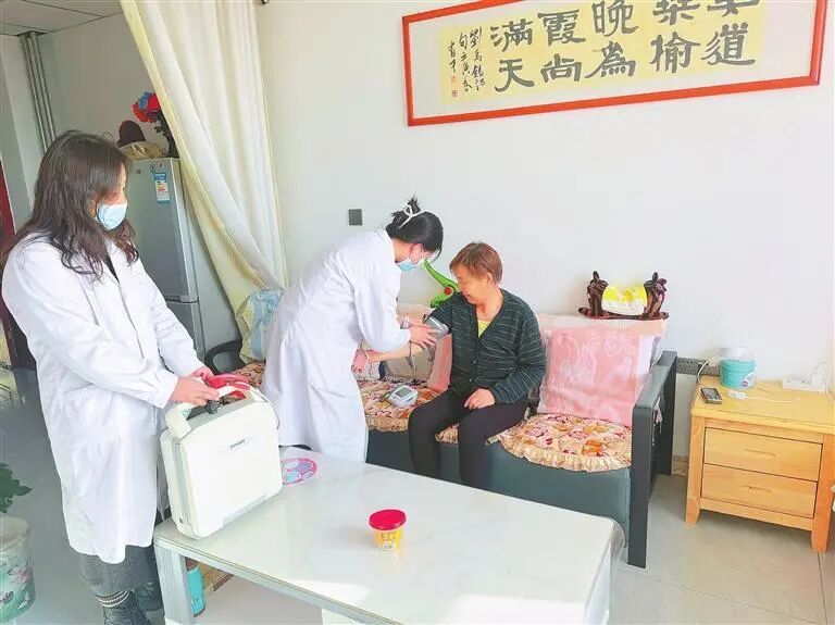 在民勤县康养医养中心,医护人员为老人量血压。