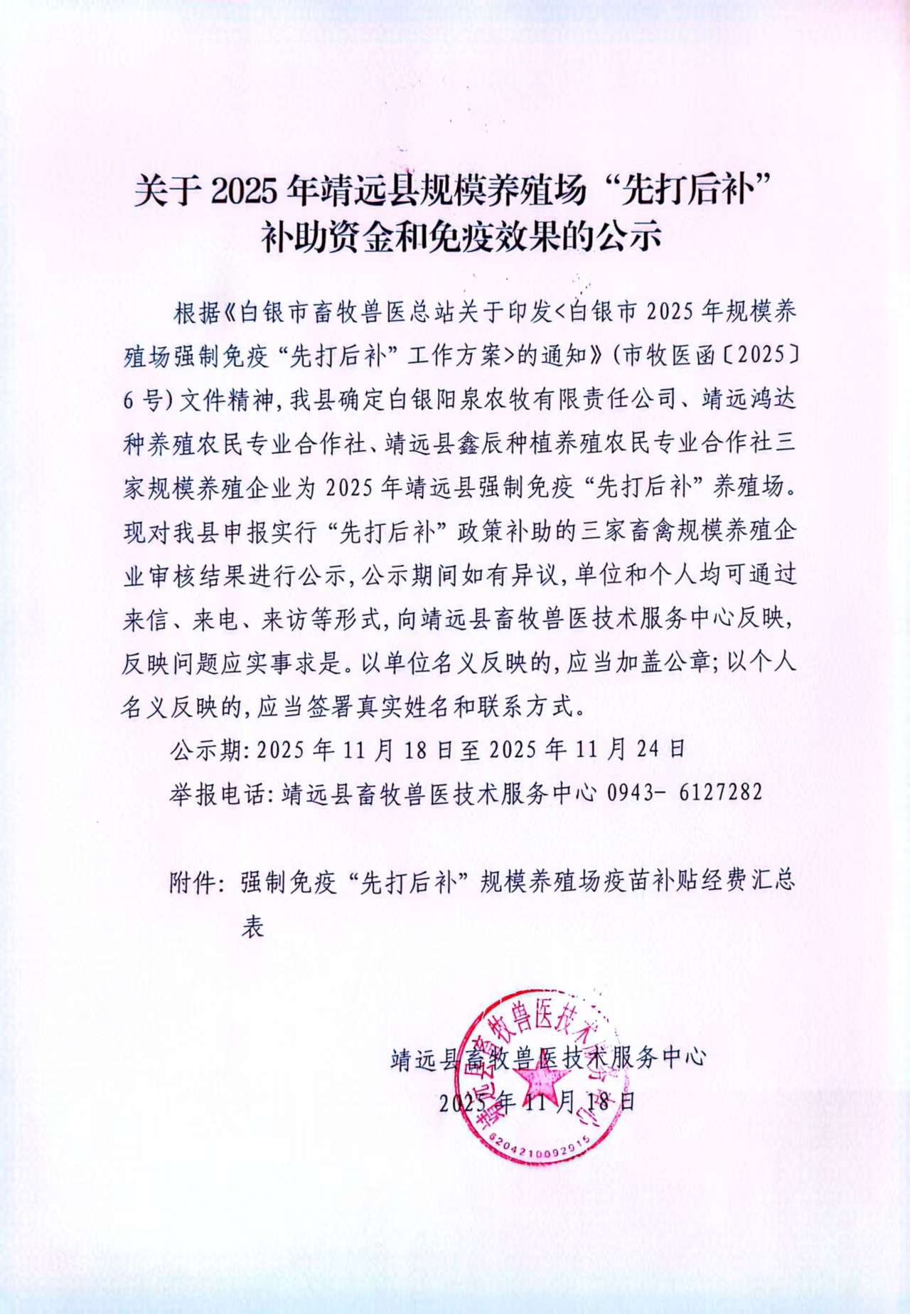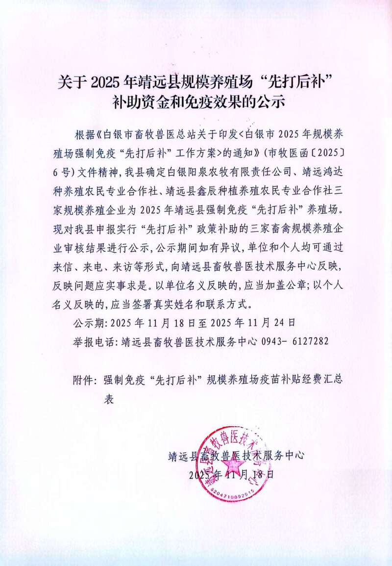 | 关于2025年靖远县规模养殖场“先打后补”补助资金和免疫效果的公示 | |||||||||||||||||||||||||||||||||||||||||||||||||||||||