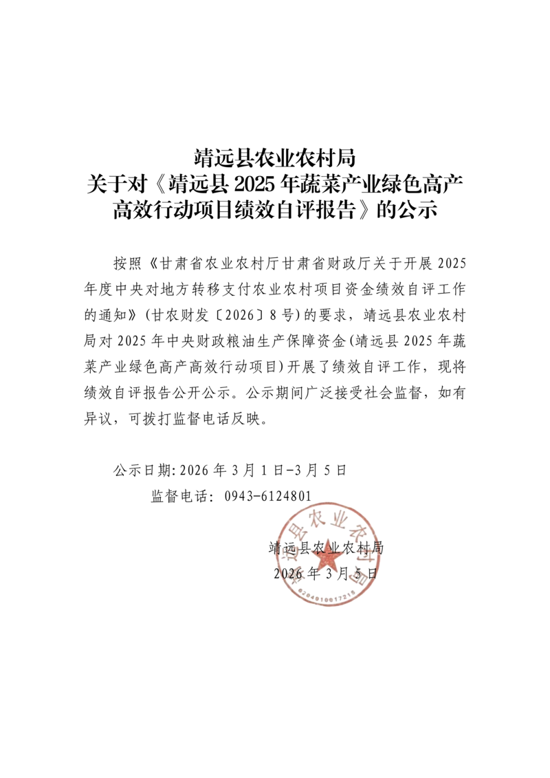 靖远县农业农村局关于对《靖远县2025年蔬菜产业绿色高产高效行动项目绩效自评报告》的公示