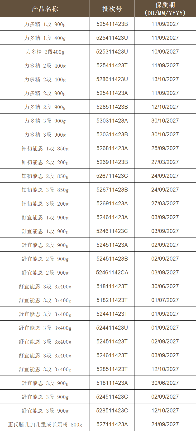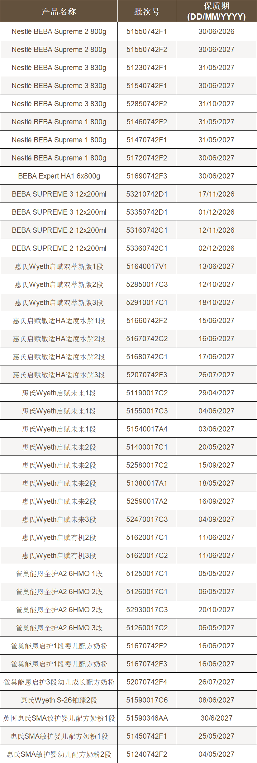 @宝妈宝爸们注意! 总部位于瑞士的雀巢公司 近日表示 已在全球31个国家和地区 发布针对部分批次婴幼儿配方奶粉产品的 召回通知 1月6日,继召回欧洲市场奶粉后 雀巢公司再次发布公告 回收在中国大陆销售的多批次婴幼儿奶粉 雀巢中国方面人士表示 食品安全与品质是重中之重 雀巢中国对此高度重视 中国市场少数产品可能受到影响 作为预防性举措 已经对部分特定批次的 婴幼儿配方奶粉进行了回收 受影响批次 01 出于高度谨慎考虑,雀巢中国自愿回收所有此次涉事的进口自欧洲、在中国大陆跨境电商渠道销售的婴幼儿配方奶粉。 经统计,涉及雀巢能恩、惠氏启赋等品牌共41个批次。 02 作为一项预防性措施,雀巢自愿回收在中国大陆销售的特定批次婴幼儿配方奶粉。 经统计,涉及力多精、铂初能恩、舒宜能恩和惠氏膳儿加儿童成长奶粉共4个品牌,总计30个批次。 本次回收范围之外的所有其他雀巢产品及同类产品的其他批次均可安全食用。 同时,所有在中国大陆市场注册并销售的雀巢能恩全护6HMO、NAN Supreme、S26金装、雀巢特殊医学用途婴儿配方食品、超启能恩、启赋、S26铂臻等不受影响,敬请放心食用。 该举措完全出于预防考虑,因为涉及近期在相关批次所用的某一款供应商原料可能存在质量瑕疵。截至目前,我们尚未收到与相关产品有关的任何不适报告。尽管如此,出于高度谨慎,雀巢决定根据严格的产品质量与安全管理规范,进行本次自愿回收。 回收措施 如消费者已购买以上特定批次产品,请勿将其喂食给孩子,请致电我们的客户服务热线 (雀巢产品:4006104868; 惠氏产品:4007001826) 联系退款退货事宜。如对孩子健康有任何担忧,请及时联系儿科医生或医疗服务机构。 @宝妈宝爸们 赶紧看看家里有没有相关产品! |