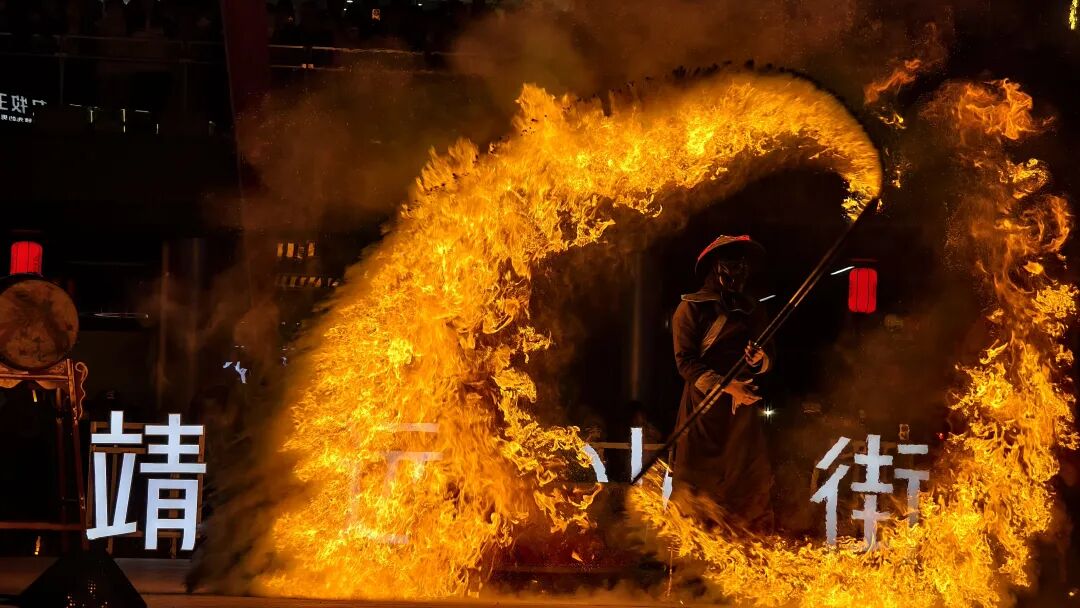 夜幕降临,非遗火戏震撼开演,艺人手持火壶、火轮翻飞腾跃,焰光流转、气势如虹,惊险又惊艳的传统技艺引得现场掌声、喝彩声不断。水上飞人踏浪腾空,凌空翻转、水花与火光同框交织,上演“水火交融”的视觉奇观,成为本次街演最具冲击力的打卡名场面。