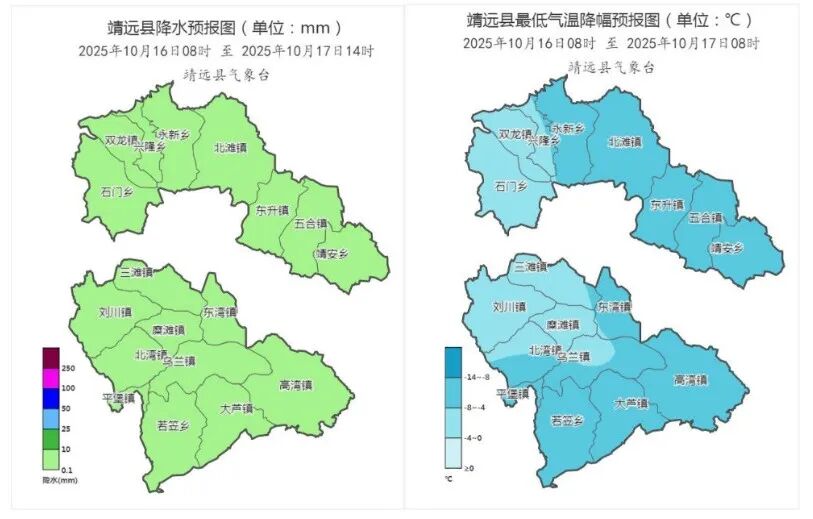图1 靖远县2025年10月16日08时至17日14时降水预报图(左)靖远县2025年10月16日08时至17日08时最低气温降幅预报图(右)三、对策建议1.防范降水降温、大风沙尘、大雾天气,造成能见度低、道路湿滑对交通安全、城市运行等的不利影响,建议相关部门加强交通安全管理和道路清理工作。同时,旅游景区、户外游乐场所、露营营地等密切关注气象信息,在降水期间,及时调整高空、水上等易受影响的游乐项目,引导游客合理安排行程,确保游客生命财产安全。2.请广大民众注意天气变化,降温时段适当增添衣物,合理安排出行,注意交通安全,外出注意避开易积水路段和涵洞;降水间歇时段,需防范大雾天气对交通安全的不利影响。3.各地抢抓有利天时,加快秋收秋种进度,已成熟作物及时晾晒入仓,谨防霉变,做好防潮和防冻等工作;过湿田块及果园注意排涝降渍,做好果园病虫害监测与防治;提请各地做好温棚加固抗风、增光补温和保暖防冻等工作,同时注意牲畜圈舍保暖与防寒防冻。4.此次降水过程预报时效较长、天气变化存在不确定性,请及时关注气象部门每日发布的最新预报预警信息。 |