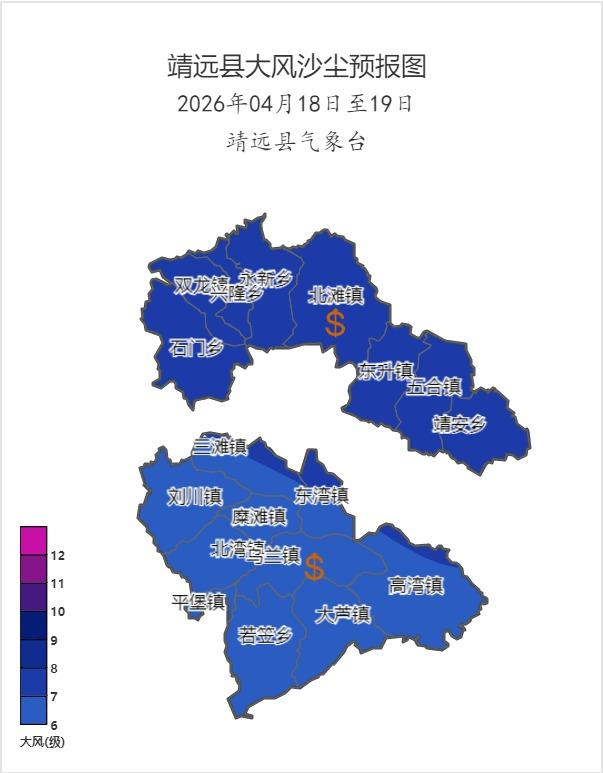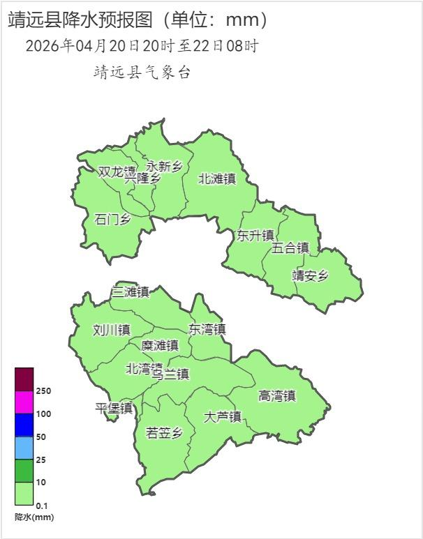 图2 靖远县2026年4月20日20时至22日08时降水预报图 二、影响分析 有利影响:降水天气有利于优化空气质量及降低森林草原火险等级。 不利影响:1.大风沙尘天气对户外活动、交通运输、春耕春播、畜牧业、设施农业、空气质量等有一定的不利影响;2.雨雪及大雾天气造成道路湿滑、能见度低等对交通运输有一定的不利影响;3. 目前我市大部林果进入盛花期,春小麦处于苗期,降温天气易增加霜冻风险等级。 三、对策建议 1.注意防范大风沙尘、降水、大雾天气对户外活动、交通运输、畜牧业、设施农业及空气质量等的不利影响,提前做好设施大棚、牲畜圈舍、户外易跌落物品的防风加固工作。 2.降水、大雾天气易造成能见度低、道路湿滑,下坡、急弯、桥梁、高速公路、山区道路风险大,建议相关部门加强交通安全管理和道路清理工作,确保交通运行安全。 3.降温天气增加霜冻风险等级,建议各地做好花期林果防冻措施,并加强已出苗春小麦的田间管理,减轻霜冻危害。 4.提请相关部门继续加强能源保供工作,做好供电、供水等调度保障。