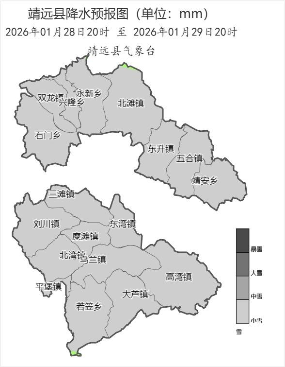图1 靖远县2026年1月28日20时至29日20时累积降雪预报图 三、对策建议 1.降雪、降温天气造成能见度低、道路湿滑结冰,对道路交通安全影响较大,建议各相关部门加强高速、国省干道、县政道路、急弯陡坡、临水临崖、窄桥窄路等重要路段的路况巡查,做好交通安全管理和道路清理工作。 2.降雪、降温、大风天气对城市运行、能源保供、设施农业、畜牧业等有不利影响,做好供电、供水、供暖等调度保障,提前做好设施农业和牲畜圈舍的防寒保暖应对措施。 3.降温天气易使流感发生,脆弱人群发生呼吸道和心脑血管等疾病的风险增加,请广大民众做好健康防护。 4.提醒广大民众要强化安全意识,注意用火、用电安全,预防火灾发生;自行取暖住户谨防一氧化碳、煤气等中毒。 5.气温较低及高海拔地区,建议货车司机根据情况使用抗冻性能较强的柴油,防止由于低温引起的油箱冻结。