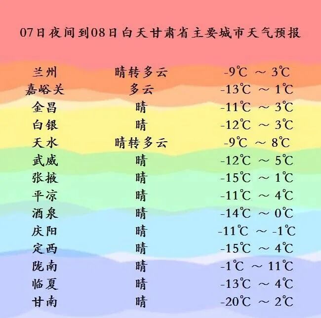 中央气象台预计,1月8日至1月10日,甘肃、河北、河南、黑龙江等地气温将下降4到8℃、局地10℃以上。由于晴空辐射降温导致最低气温将维持偏低水平,未来几天我国大部地区昼夜温差较大,尤其安徽、福建、江西等地部分地区温差会超过15℃。 甘肃短期天气预报 记者从甘肃省气象局了解到,今天夜间到明天白天(1月7日20时—1月8日20时),酒泉、甘南、陇南三市州多云,局部地方阴有小雪或雨夹雪,甘肃其余地方晴或多云。另外,河西五市有5级左右西北风,局部地方有沙尘。 明天夜间到后天白天(1月8日20时—1月9日20时),酒泉、嘉峪关、张掖、甘南等市州多云,局部地方阴有小雪;甘肃其余地方晴或多云。另外,河西五市及甘南、庆阳两州市有4—5级西北风。 1月9日夜间到1月10日白天(1月9日20时—1月10日20时),甘肃各地晴或多云。