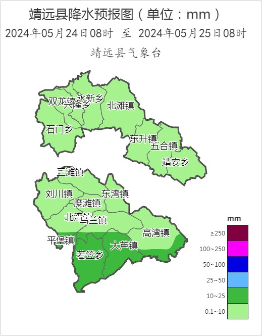 图1 靖远县5月24~25日降水量预报图 三、对策建议 1.此次过程我县南部有强降水天气,发生山洪地质灾害和中小河流洪水气象风险较高,需加强雨情、水情监测,做好地质灾害易发区和隐患点的巡查工作,防范强降雨引发的山洪地质灾害、中小河流洪水、泥石流以及城乡积涝等灾害。 2.降水利于农田增墒,对农作物及林果生长有利,请做好田间水肥管理。 |