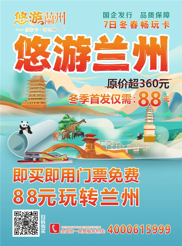 兰州市文旅局、兰州黄河生态控股集团联合推出“悠游兰州”7日冬春畅玩卡!准备来兰州的、本地遛娃的朋友们 赶紧看过来! “悠游兰州”7日冬春畅玩卡 即日起正式发售 88元能登黄河楼、赏水墨丹霞 还能夜游黄河、逛野生动物园 既省钱又省心 再加上餐饮住宿打折 这波赚翻了,错过等一年! 【水墨丹霞】 门票+观光车免费。离城市最近的世界级丹霞地貌!丹顶揽胜、九色丹青、丝路霞光超震撼,拍照巨出片~ 【黄河楼】 免费登楼。俯瞰黄河穿城而过的壮阔,还能逛光影博物馆、黄河奇石展,读懂兰州千年文化! 【夜游黄河】 游船免费坐。乘游船看中山桥、白塔山夜景,兰州的浪漫全在这了! 【野生动物园】 免费入园。和大熊猫、长颈鹿等200余种动物亲密接触,亲子游、家庭游直接锁定! 不只是景区 吃住游购全打折 承包您的兰州开销! 活动时间:2025年11月13日至2026年3月1日。 适合人群:全国游客(含本地居民)。 价格:88元/张。 有效期:激活后7天内有效。 购买方式:公众号搜索“悠游兰州”微商城下单购买,或者抖音搜索“兰州文旅集团公司”团购。 客服热线:4000615999 这个冬天 88元的价值超越想象 兰州的温暖驱散寒冷 一张卡,一座城,一段难忘旅程 我们在兰州,等你来! (具体优惠措施请以当地文旅部门解释为准 客服热线:4000615999) |