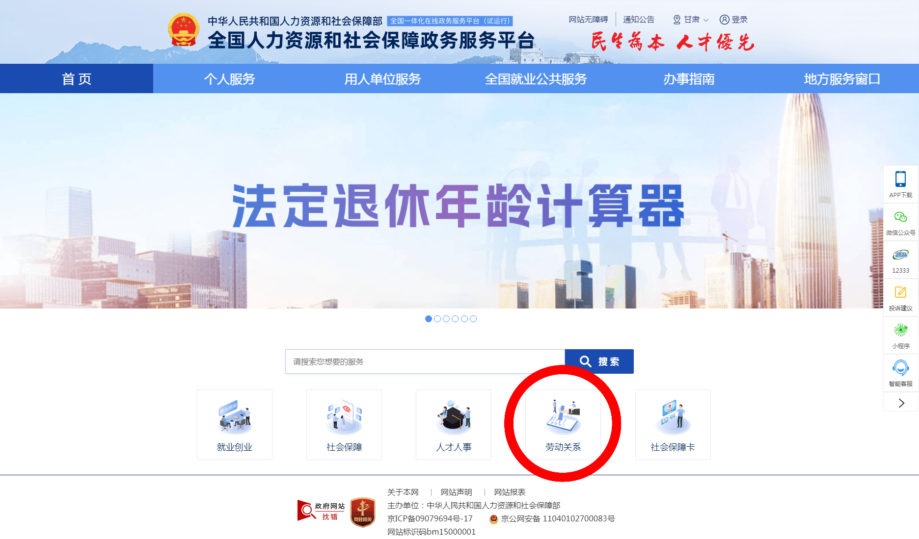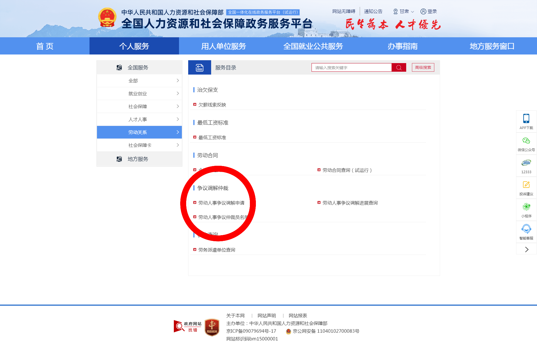 方式二:登录全国人力资源和社会保障政务服务平台(http://www.12333.gov.cn/),点击“劳动关系”“劳动人事争议调解申请”。