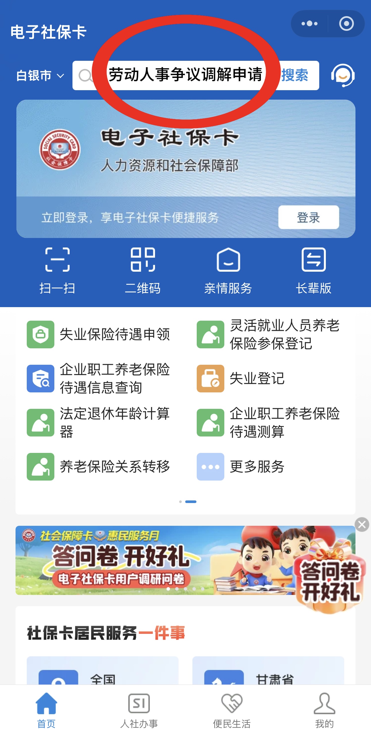 方式四:登录电子社保卡小程序或APP,搜索“劳动人事争议调解申请”。