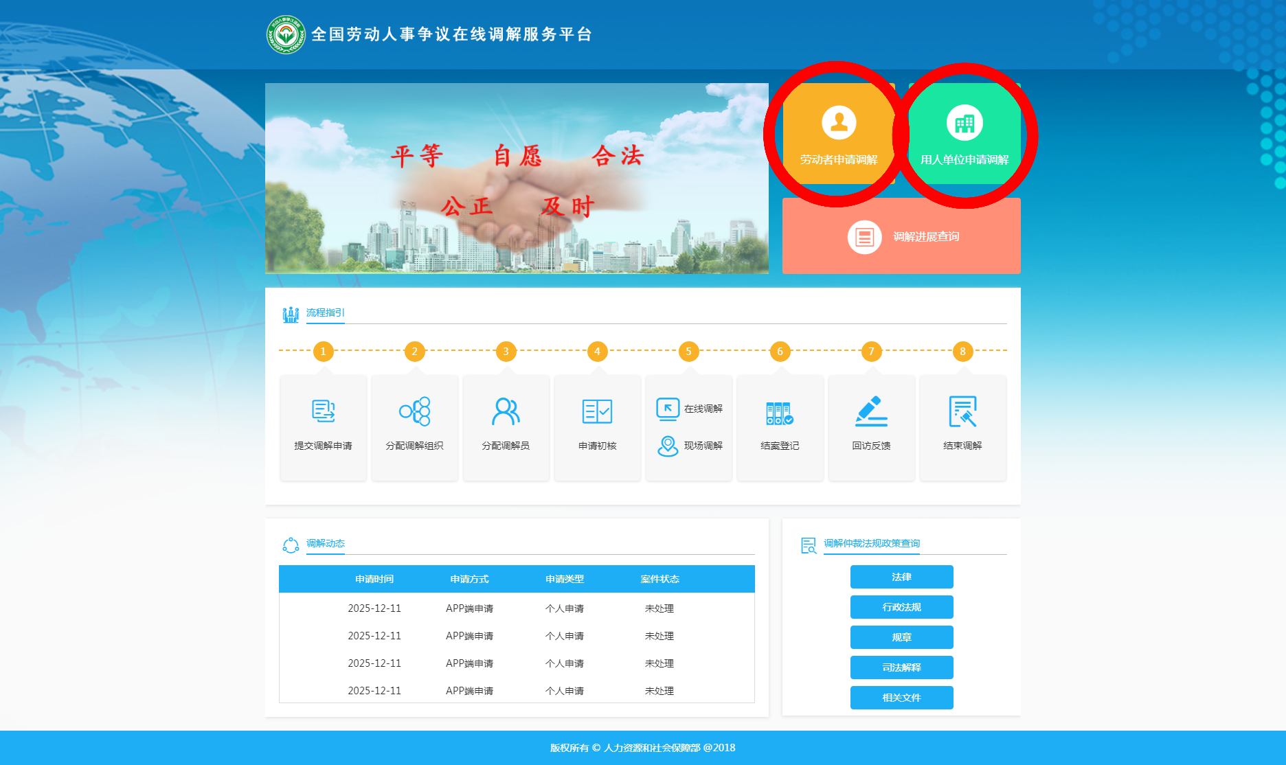 为提高调解效率,以更柔和、更高效的方式化解纠纷,人力资源社会保障部推出了“互联网+调解”平台(即全国劳动人事争议在线调解服务平台)。该平台为劳动者和用人单位提供在线调解申请、法律政策查询、案件进展跟踪等一站式服务。 如何使用?非常简单! 只需登录平台,按照指引填写相关信息并提交,即可完成调解申请。提交后,平台管理员将把案件分配至相应的调解组织,由调解员进行初审、受理并开展调解工作,真正实现劳动人事争议调解的“马上办、网上办、就近办”。 轻松申请,少跑腿;在线调解,更省心! 不管是劳动者还是用人单位,都能通过这个平台快速找到解决途径,让纠纷化解在源头、解决在基层。 以下是四种申请方式! 方式一:进入全国劳动人事争议在线调解服务平台(http://tiaojie.12333.gov.cn/portal),点击“劳动者申请调解”或“用人单位申请调解”。