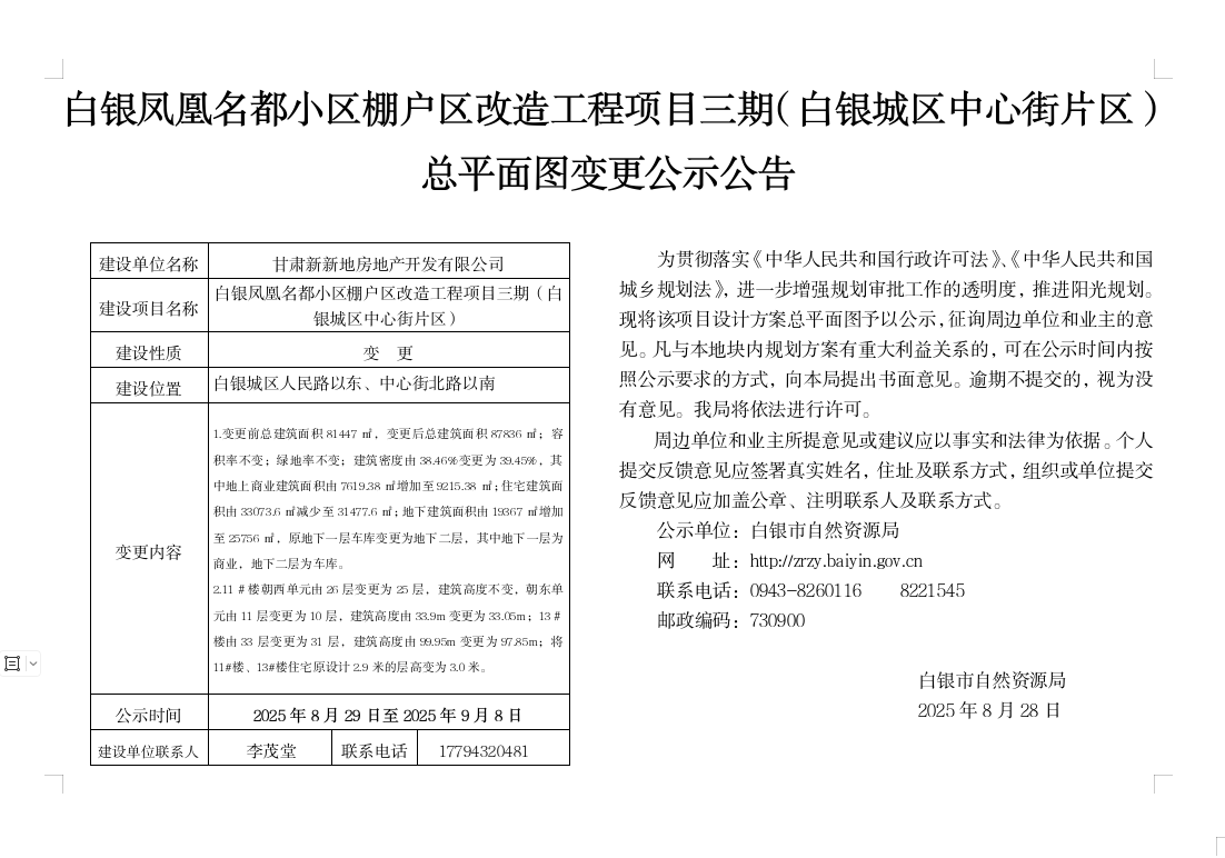 白银凤凰名都小区棚户区改造工程项目三期(白银城区中心街片区)总平面图变更公示公告
