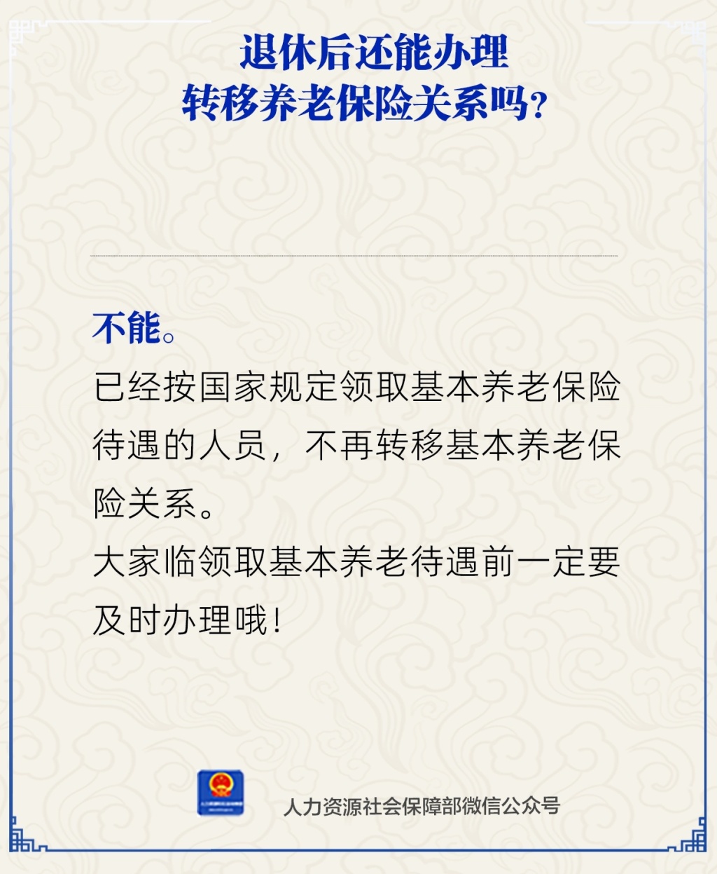 据人力资源和社会保障部公众号消息,退休后还能转移养老保险关系吗?就这一问题,人力资源和社会保障部回应称,不能。已经按国家规定领取基本养老保险待遇的人员,不再转移基本养老保险关系。