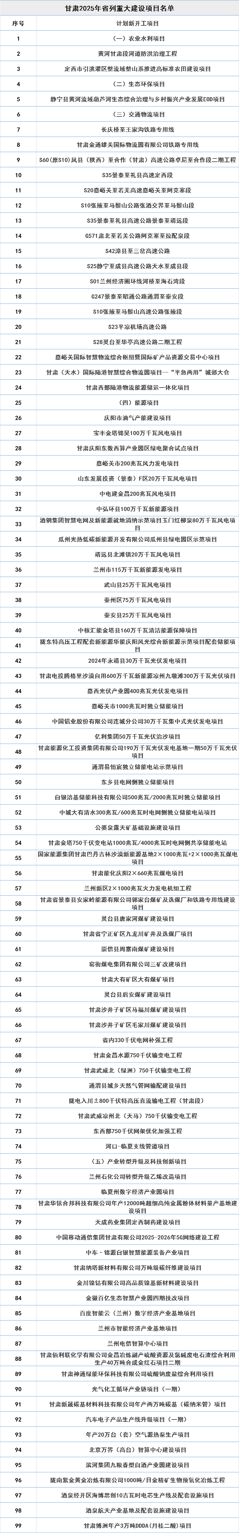 项目包括:S20嘉峪关至若羌高速嘉峪关至阿克塞段、S03天水绕城高速公路北绕城段、S42漳县至三岔高速公路、S23平凉机场高速公路、安宁堡街道棚户区(城中村)改造重建安置项目、中电建金昌200兆瓦风电项目、甘肃能源化工投资集团190万千瓦光伏发电基地一期50万千瓦光伏项目、崇信县周寨南煤矿建设项目、陇南市中心城区地下管网更新改造项目、灵台县达溪河新集水库工程、嘉峪关机场改扩建工程、G30连霍高速清水驿至忠和段扩容改造项目、兰州市七里河兰海物流棚户区改造项目、陇西经济开发区(中医药循环园区)基础设施一期项目等。(后附清单)