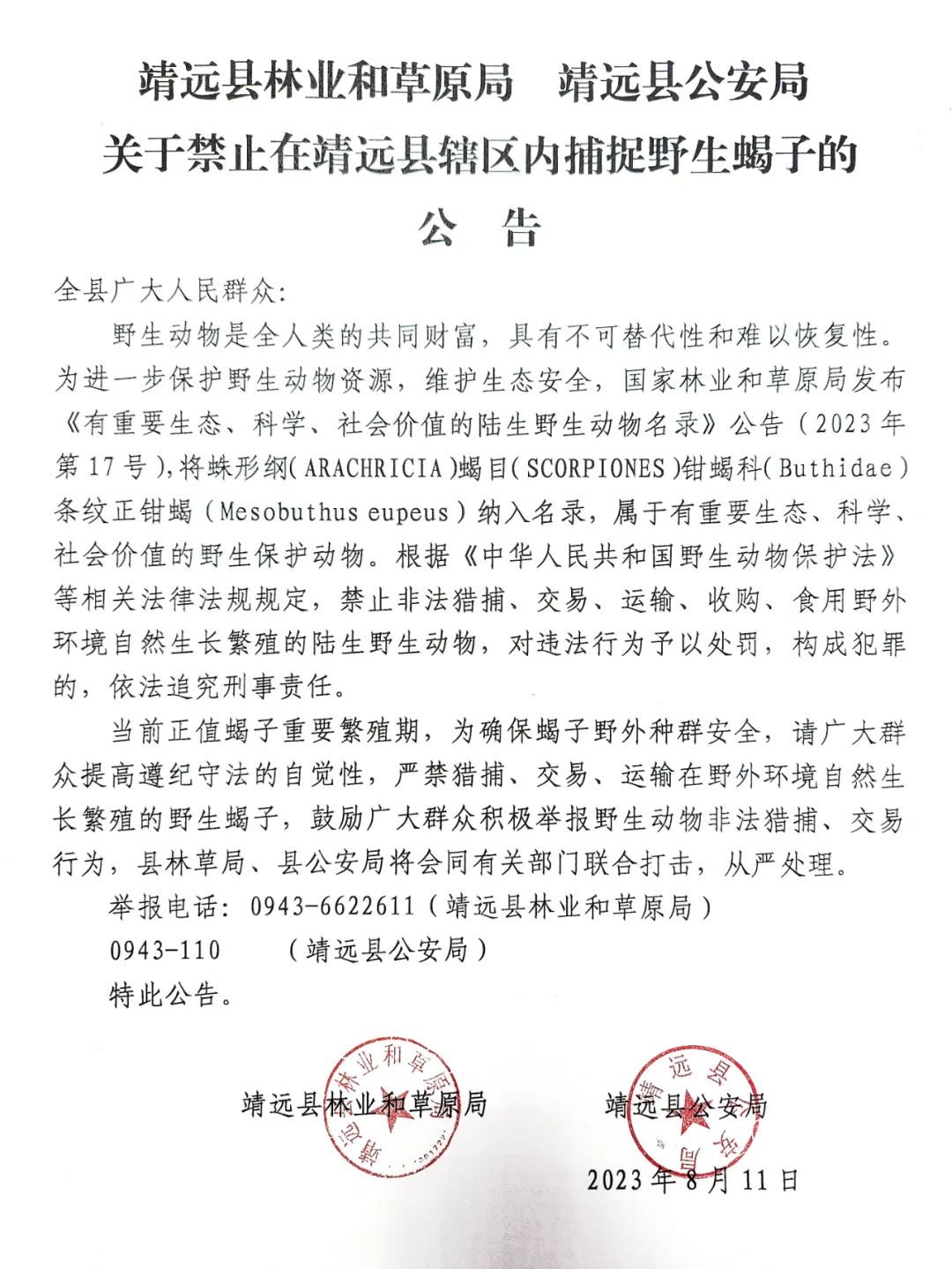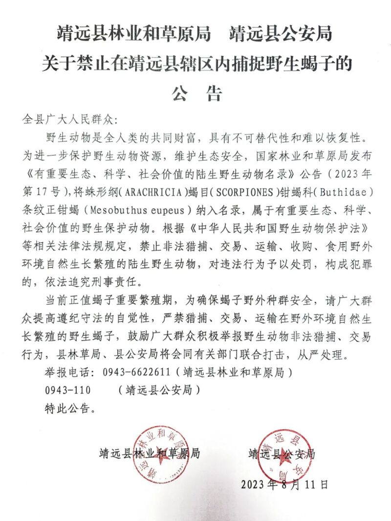 关于禁止在靖远县辖区内捕捉野生蝎子的公告