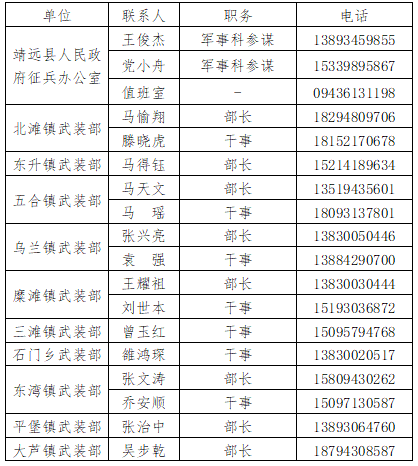 靖远县2025年上半年征兵公告 广大适龄青年及家长朋友们: 一、报名时间 男青年:2024年12月1日至2025年2月18日。 女青年:2025年1月1日至2月18日。 二、征集对象及年龄 男青年:高中(含中专、职高、技校)毕业生及以上文化程度的男青年(含高校在校生),年满18-22周岁(2003年1月1日-2007年12月31日出生);普通高等学校本专科毕业生,上半年符合毕业条件的毕业班生,年满18-24周岁(2001年1月1日-2007年12月31日);研究生毕业生及在校生放宽至26周岁(1999年1月1日-2007年12月31日)。以大学生为重点征集对象,突出各级各类学校毕业生征集,优先征集大学毕业生、理工类大学毕业生、高级技工和技师学校毕业生。 女青年:普通高等学校全日制应届毕业及在校女生应征报名,需年满18至22周岁。 三、征集条件 (一)政治条件 按照《军队征集和招录人员政治考核规定》及有关规定执行。 (二)身体条件 1.身高:男性160CM以上,女性158CM以上。 2.体重:男性体重标准为17.5≤BMI<30且空腹血糖<7.0mmol/L;女性体重标准为17≤BMI<24且空腹血糖<7.0mmol/L。BMI>28须加查血液糖化血红蛋白检查项目,糖化血红蛋白百分比<6.5%,合格。 BMI=体重(KG)/身高(m)的平方。 3.视力:应征男女青年任何一眼裸眼视力不低于4.5;采取准分子激光手术矫正视力的应征青年,手术时间距应征时间应在半年以上,且无并发症,裸眼视力达到4.8,眼底正常。 4.面颈部纹身:着军队制式体能训练服及其他裸露部位长径超过3CM的纹身,其他部位长径超过10CM的纹身,纹眉、纹眼线、纹唇,不合格。 其他具体条件,应征青年可登录全国征兵网首页查阅《应征公民体格检查标准摘要》了解详细内容。 四、报名方式 1.登录全国征兵网(http://www.gfbzb.gov.cn/)报名。 2.联系户籍所在地的乡(镇)武装部工作人员报名(后附联系电话)。 3.关注“甘肃征兵”微信公众号,点击应征报名。 五、阶段划分 (一)应征报名(男兵上半年征集报名时间为2024年12月1日至 2025年2月18日;女兵上半年征集报名时间为2025年1月1日至 2025年2月18日)。 (二)初检初考(2024年12月1日开始)男青年网上初审合格后,由各乡镇、街道武装部根据《应征公民送检条件》的10项内容,进行初步体检和确定预征对象。 (三)体检政考(2025年2月28日前完成体检政考)初检初考合格的应征青年由县征兵办公室成立体格检查组和政治考核组进行体格检查和政治考核。 (四)役前教育(2025年3月1日至15日)县征兵办公室组织体格检查和政治考核“双合格”人员集中开展不少于7天的役前教育。 (五)审批定兵(2025年3月15日前)县征兵办公室会同相关部门,从参加役前教育的应征青年中确定新兵征集对象和替补对象。 (六)交接起运(2025年3月中旬)县征兵办公室进行身体复查、办理入伍手续、换装交接、组织欢送、起运新兵。 六、优待政策 (一)经济补偿。1.义务兵家庭优待金:从甘肃省入伍的义务兵,家庭优待金标准按其入伍时上年度全省城镇居民人均消费支出水平的95%发放,每年发放两次,以2024年入伍的义务兵为例,服役两年发放家庭优待金51384元。对高原服役的义务兵增发家庭优待金,增发标准按照我省义务兵家庭优待金标准的30%确定,义务兵服役期间,每年安排其父母进行一次免费体检。2.入伍一次性奖励金:按照大学本科以上毕业生10000元、专科毕业生7000元发放奖励金;在校生(含新生)按照本科7000元、专科5000元发放奖励金。实行进藏兵(含高原条件兵)一次性奖励金制度,按照每人10000元标准发放。符合条件的两项奖金同时享受。3.工资和津贴:由部队发放,义务兵津贴第一年1100元/月、第二年1150元/月,两年可领到约2.5万元。在艰苦边远和高原地区服役的还有额外的地区补贴。4.学费补偿代偿:对入伍大学生在校期间缴纳的学费实行一次性补偿、对国家助学贷款实行代偿。本(专)科生每年最高不超过12000元,研究生每年不超过16000元。 (二)复学升学。1.保留学籍。入伍前已被普通高等学校录取或者是正在普通高等学校就学的学生,服现役期间保留入学资格或者学籍,退役后2年内允许入学或者复学。2.复学转专业。大学生士兵退役后复学,经学校同意并履行相关程序后,可转入本校其他专业学习。3.免试“专升本”。高职(专科)毕业生及在校生(含高校新生)应征入伍,退役后在完成高职(专科)学业的前提下,可免试入读普通本科,或根据意愿入读成人本科。4.考研优惠。教育部设立“退役大学生士兵”专项硕士研究生招生计划,每年安排8000人,专门面向退役大学生士兵招收;高校学生应征入伍服义务兵退役后,3年内参加全国硕士研究生招生考试,初试总分加10分,同等条件下优先录取;服役期间立二等功及以上的退役士兵,符合研究生报名条件的可免试(指初试)攻读硕士研究生。 (三)服役发展。1.报考军校。具有普通高中毕业以上文化程度或者同等学力人员,未婚,年龄不超过22周岁(入伍前是普通高等学校的在校生、毕业生或者少数民族的,可放宽1岁),服现役满1年,不超过3年,符合部队相关条件,可报考军校。2.本科毕业生提干。对象为普通高校全日制本科以上毕业,服役满1年、不超过3年,本科年龄不超过26周岁,研究生毕业生不超过29周岁,符合部队相关条件,可以提干。3.选取军士。大学毕业生士兵可提前选取军士,同等条件下优先选取,在高校就读时间视为服役时间。4.优秀士兵保送入学。高中以上学历、中共党员、班长以上职务、荣立两个三