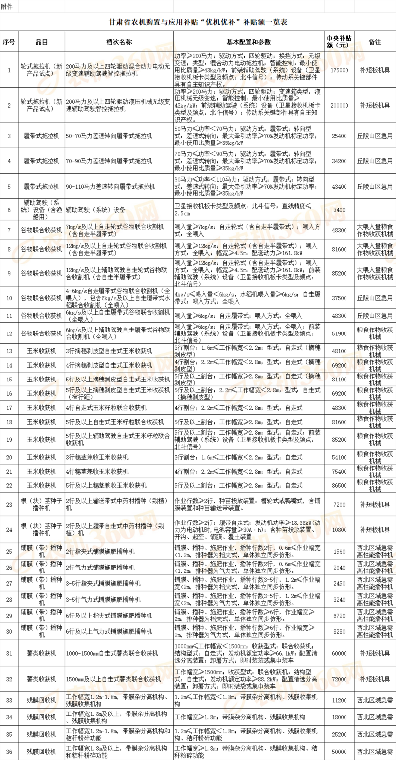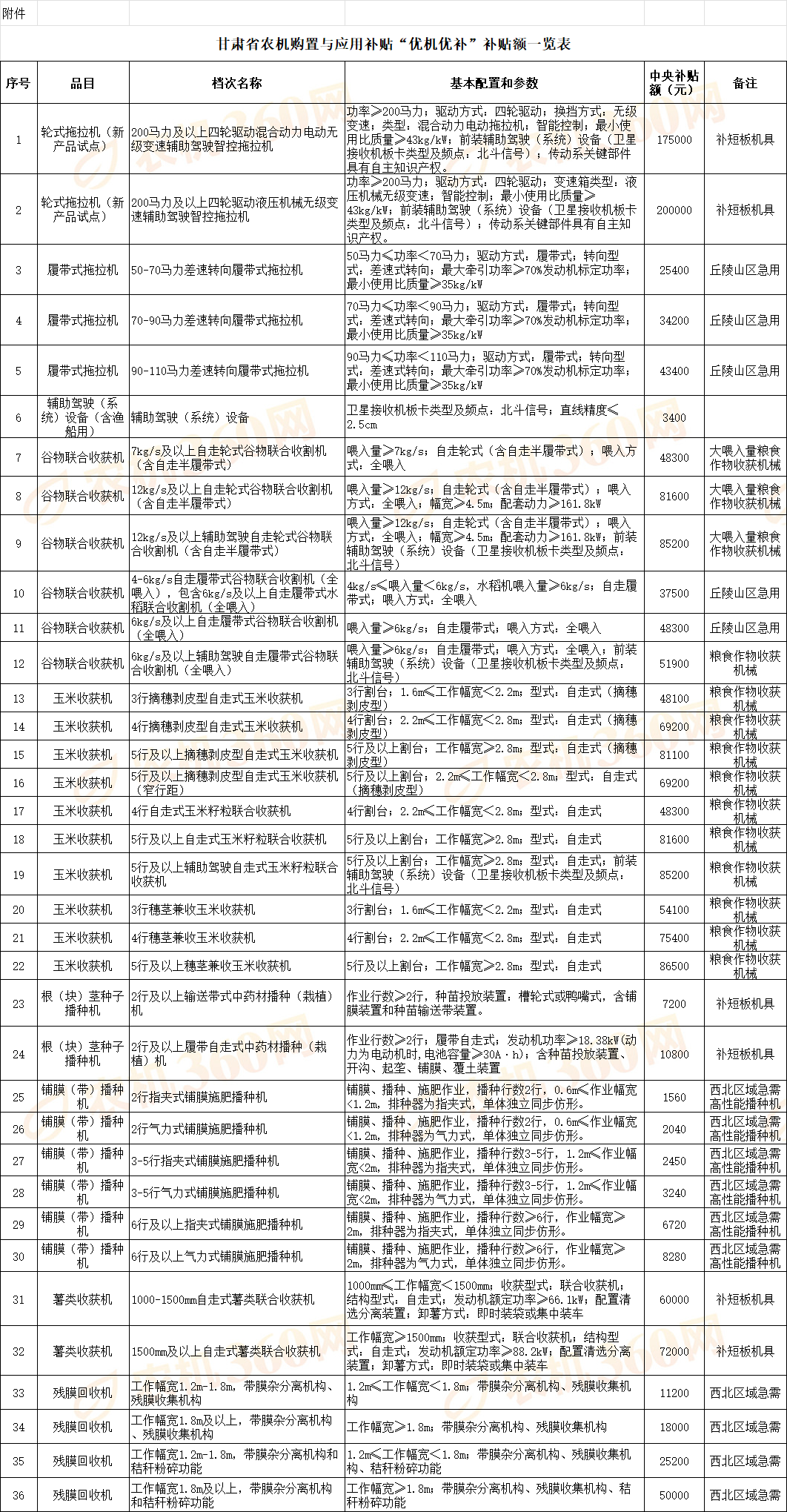 | 甘肃省农机补贴“优机优补”补贴额一览表及第四批归档公告 | |